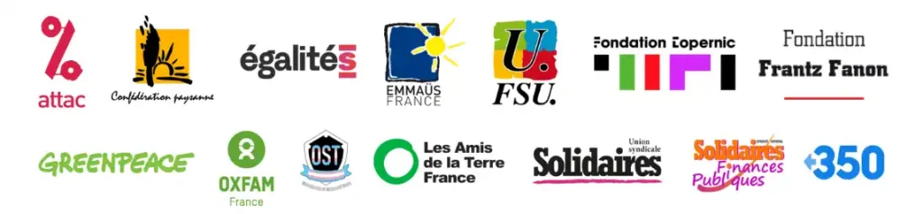 Ce rassemblement est organisé à l’appel de : 350.org, Attac France, Amis de la terre France, Egalités, Emmaüs France, Fondation Frantz Fanon internationale, Greenpeace France, FSU, Fondation Copernic, OST, Oxfam France, Solidaires finances publiques, Union syndicale Solidaires.